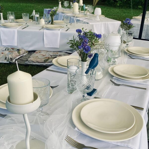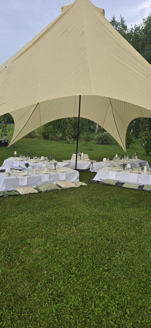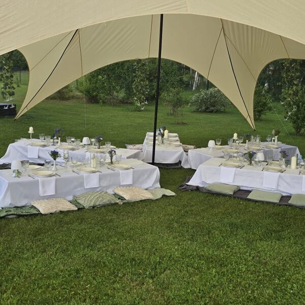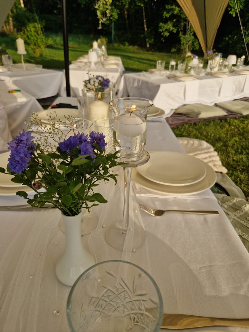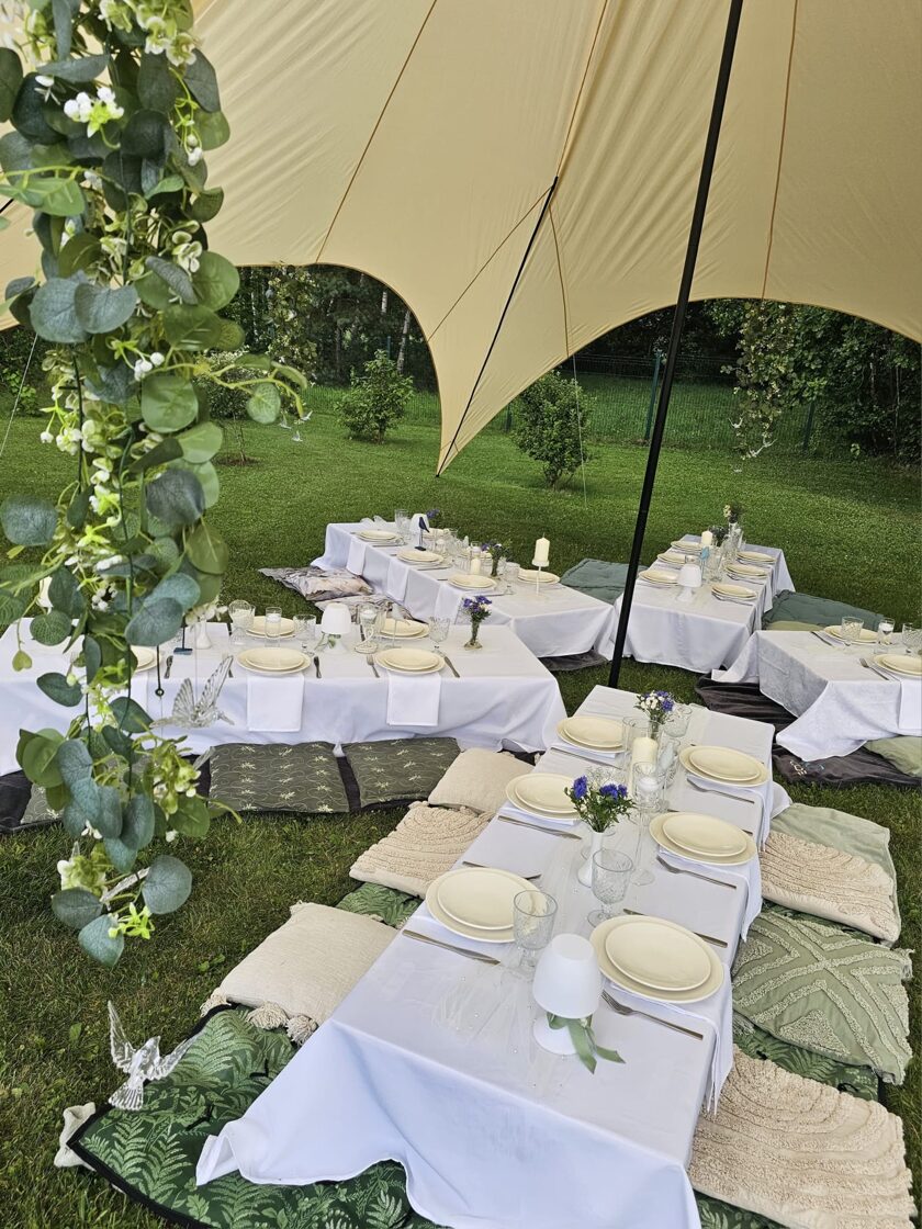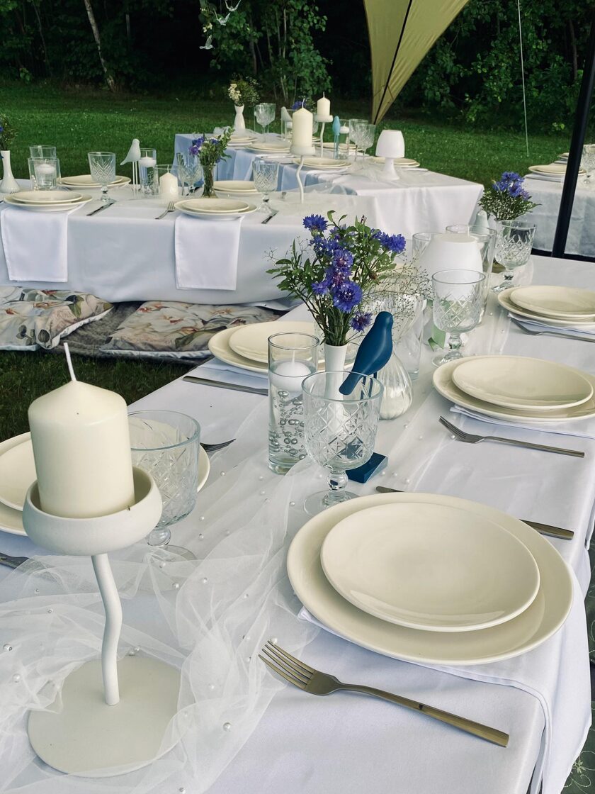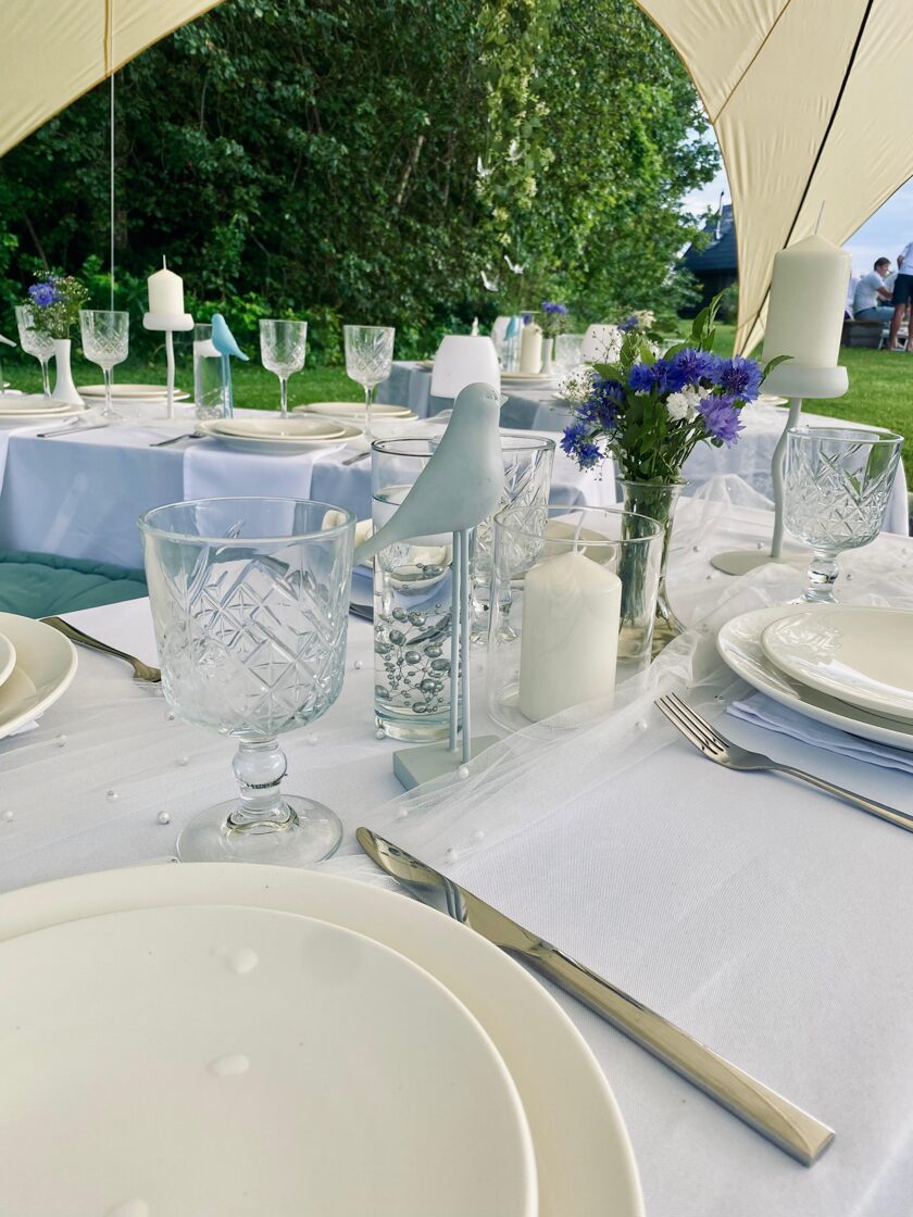 Kad draudzene svin dzimšanas dienu un baltā krāsa ir kļuvusi par viņas ballīšu tradīciju. Šis galda klājums tapa īpašam notikumam – ar pieciem atsevišķiem galdiem zem zvaigžņu telts, kurā satikās gaismas, viegla migla un vasaras vakara romantika.