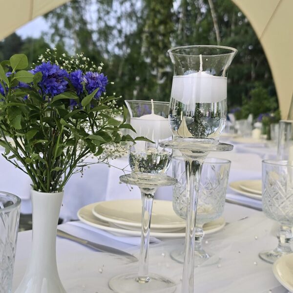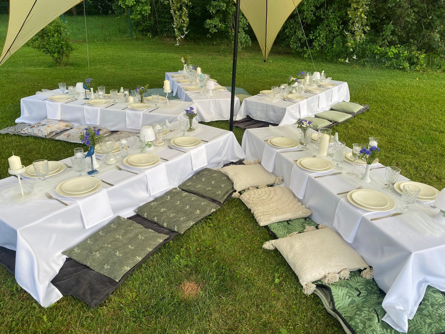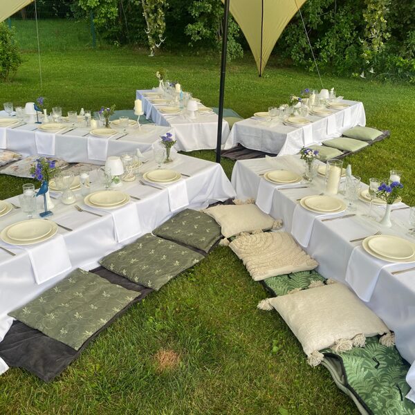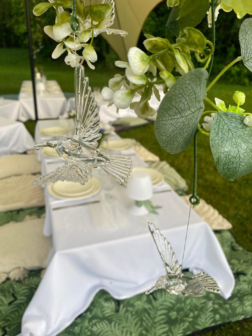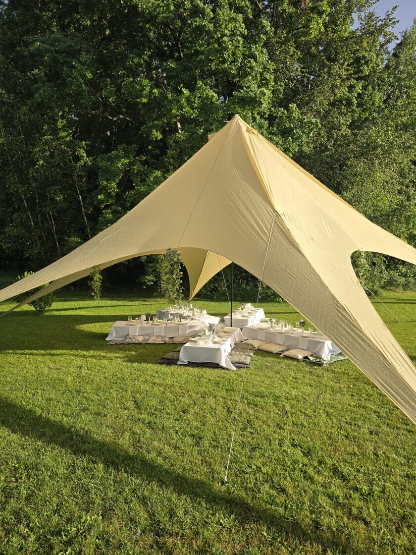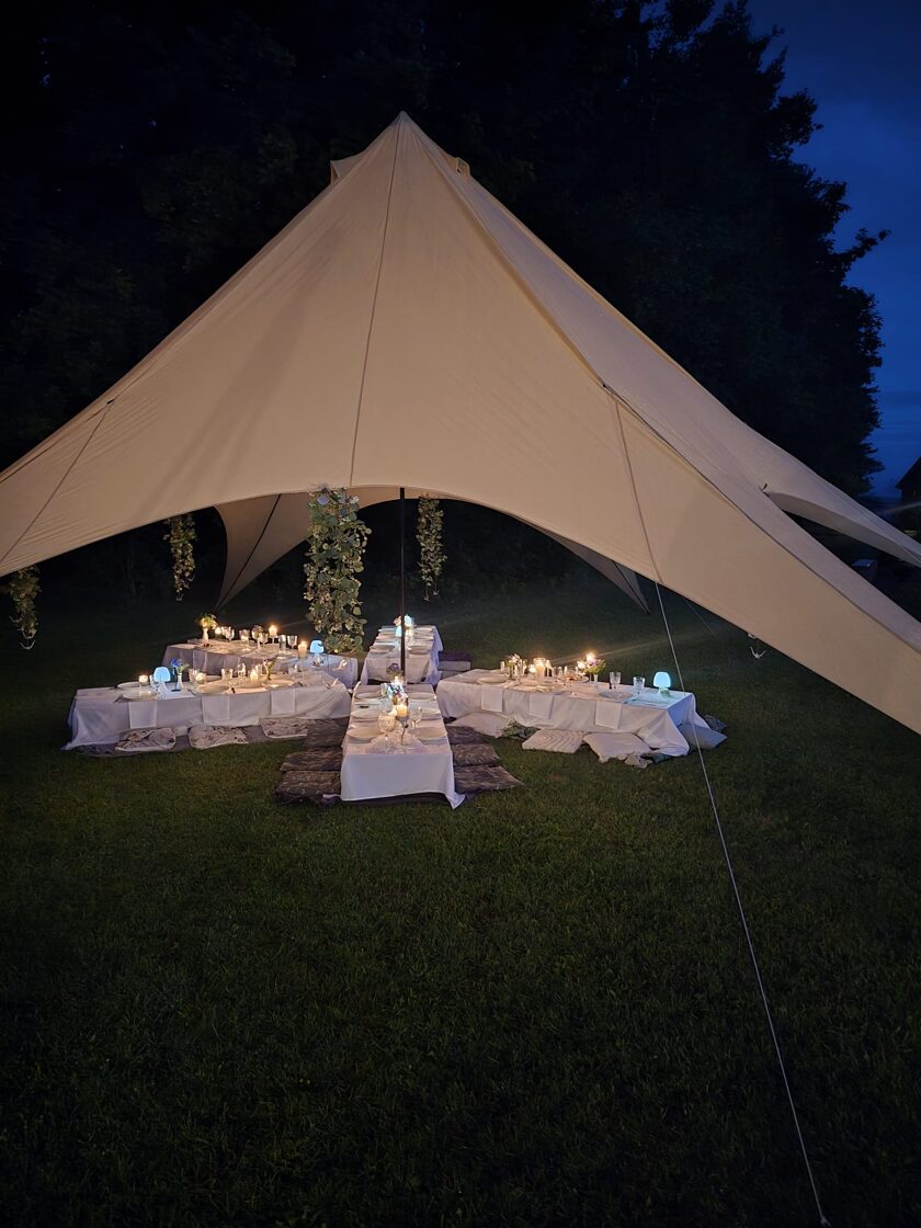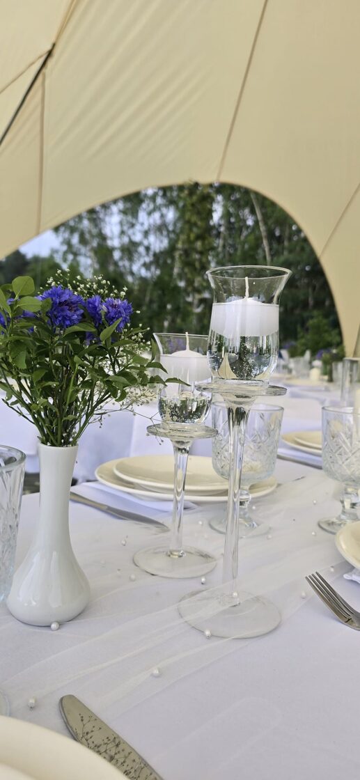 Kad draudzene svin dzimšanas dienu un baltā krāsa ir kļuvusi par viņas ballīšu tradīciju. Šis galda klājums tapa īpašam notikumam – ar pieciem atsevišķiem galdiem zem zvaigžņu telts, kurā satikās gaismas, viegla migla un vasaras vakara romantika.