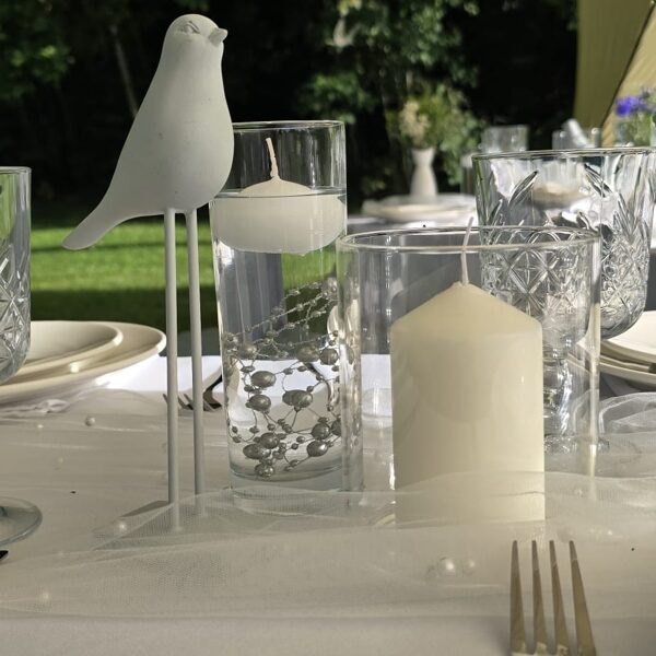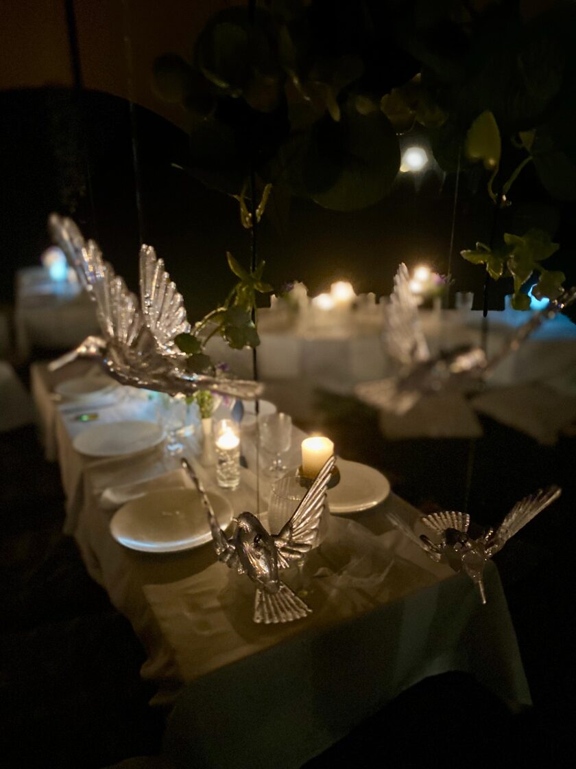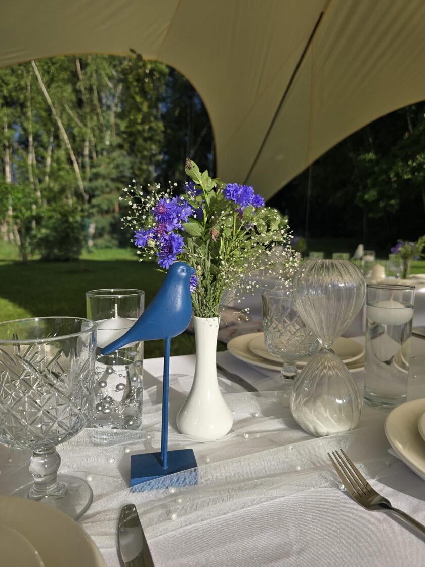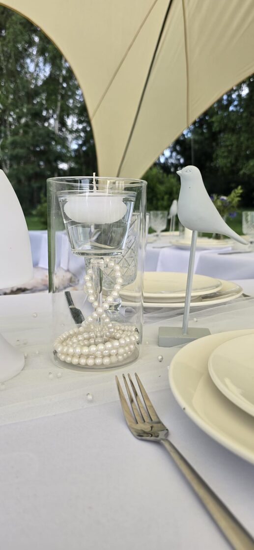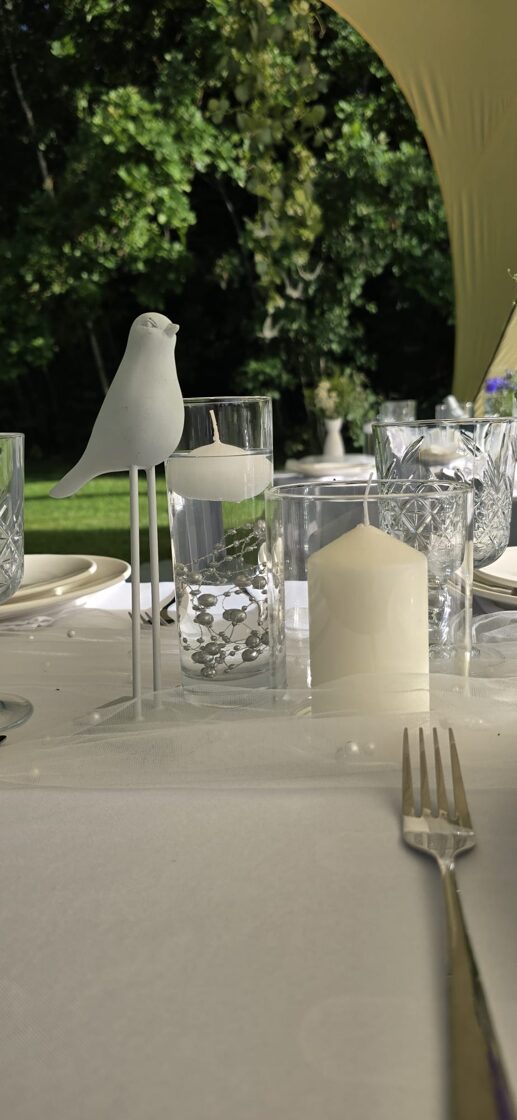 Galdi rotāti baltos un neitrālos toņos, ar niansēm tekstūrās un detaļās, kas izceļ svinīgumu, vienlaikus saglabājot nepiespiestu noskaņu. Sveču liesmas un stilizētie putni piešķīra šim vakaram vieglu, sapņainu noskaņu.