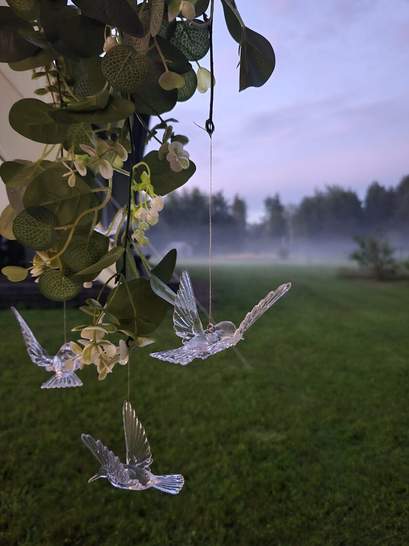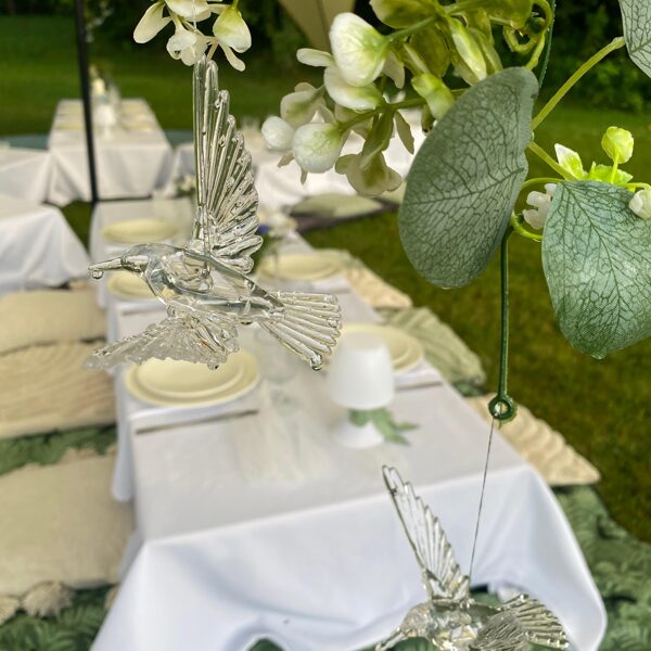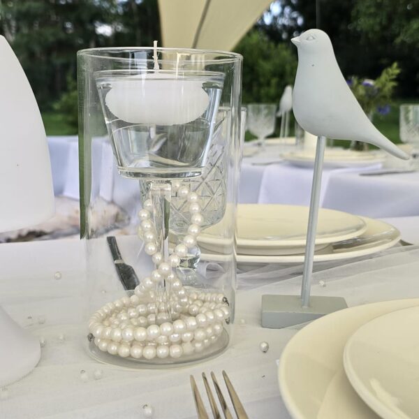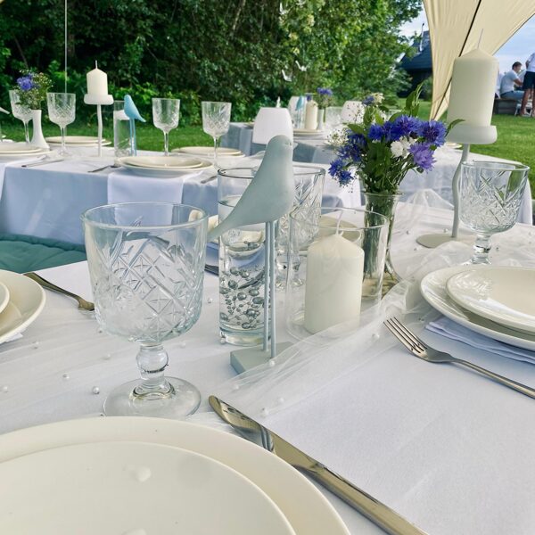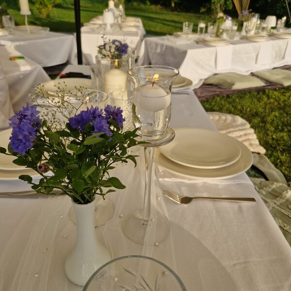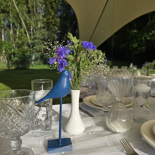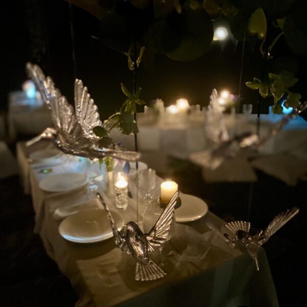Galdi rotāti baltos un neitrālos toņos, ar niansēm tekstūrās un detaļās, kas izceļ svinīgumu, vienlaikus saglabājot nepiespiestu noskaņu. Sveču liesmas un stilizētie putni piešķīra šim vakaram vieglu, sapņainu noskaņu.