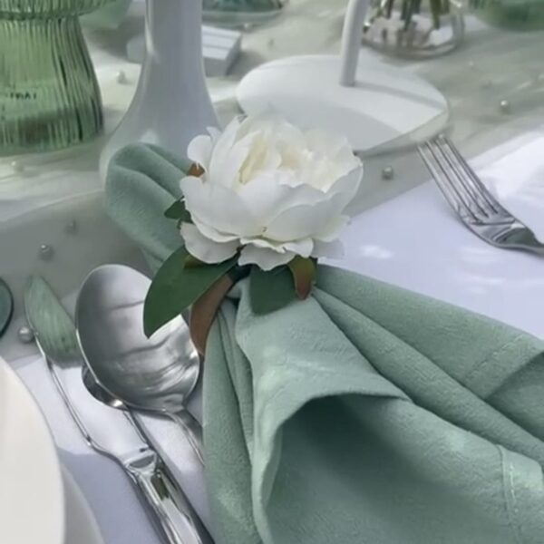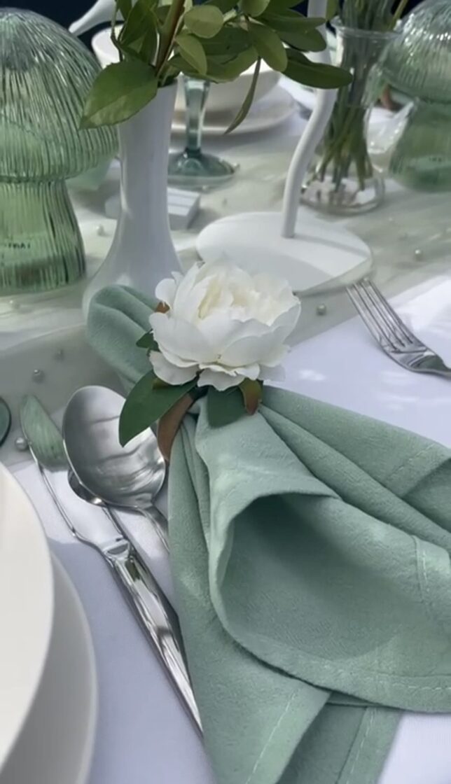 Maigi zaļās glāzes, auduma salvetes un stikla vāzītes ar ziediem papildina balto pamatu, bet lina faktūras un sveču gaisma piešķir galda klājumam siltumu un svinīgumu.