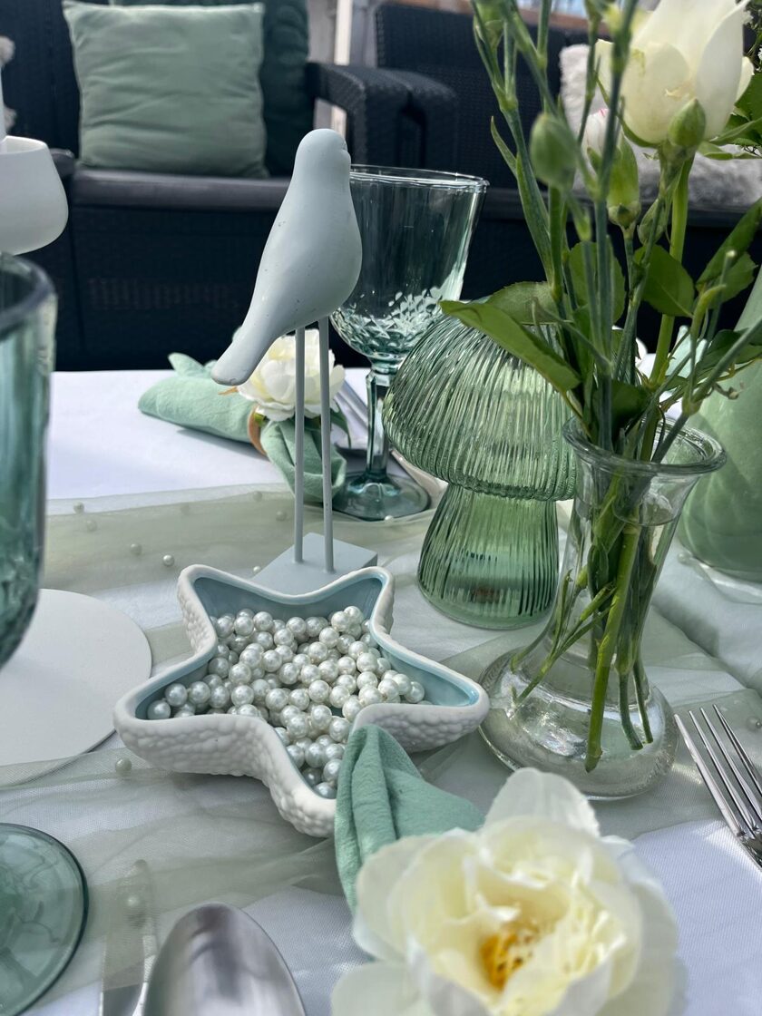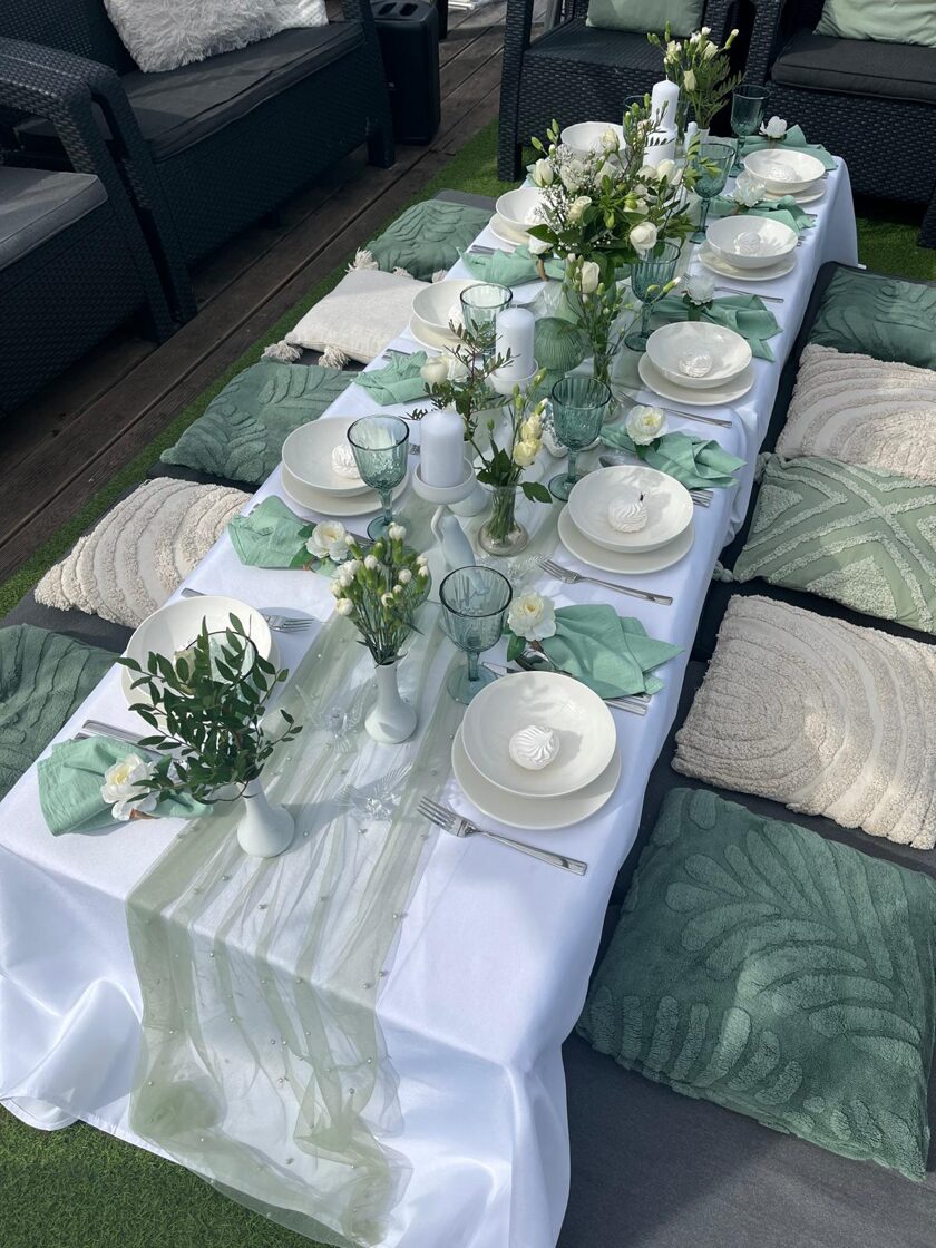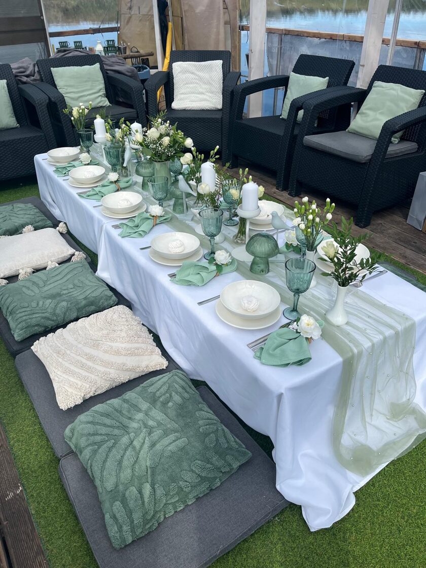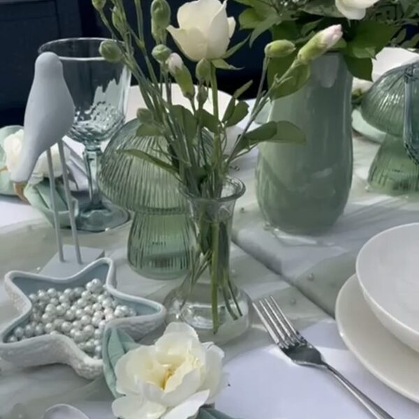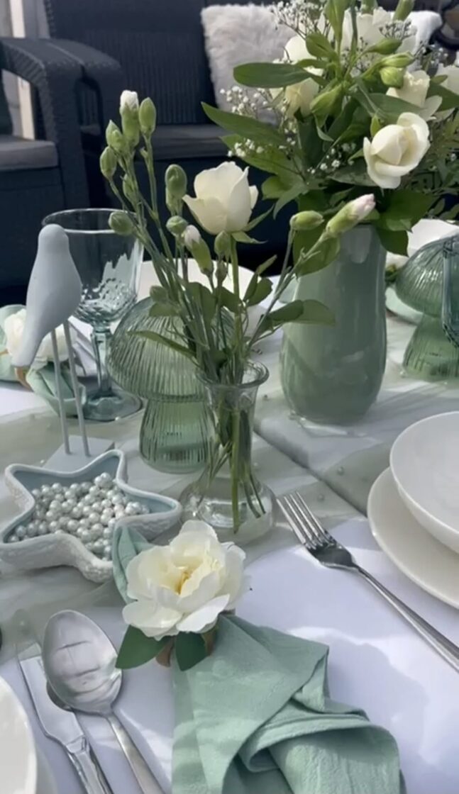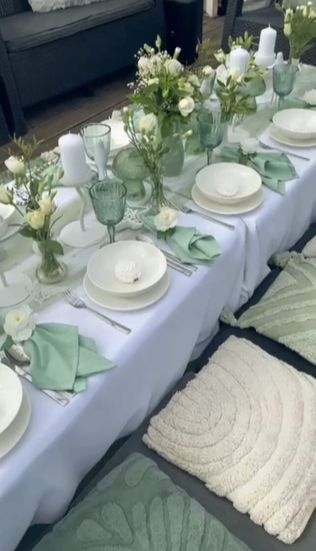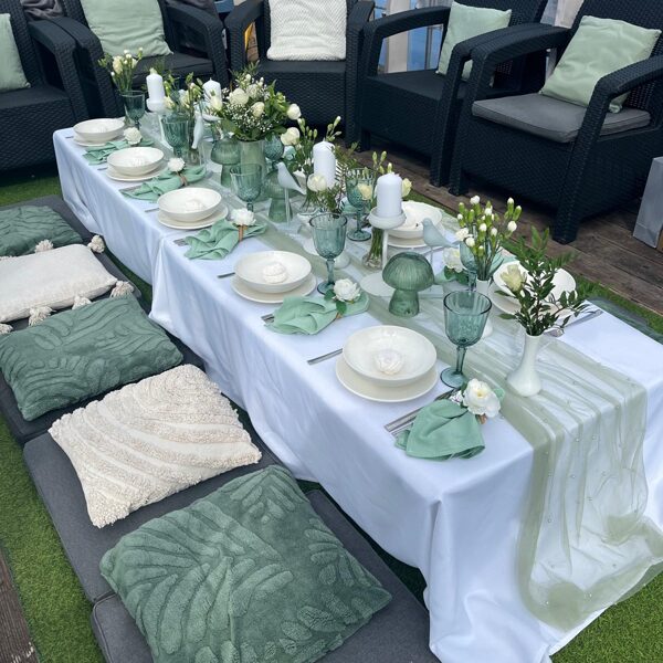 Šis galds ir kā mierpilna pastaiga dabā – zaļo un baltu toņu saspēle rada harmonisku, elegantu un vienlaikus mājīgu sajūtu.