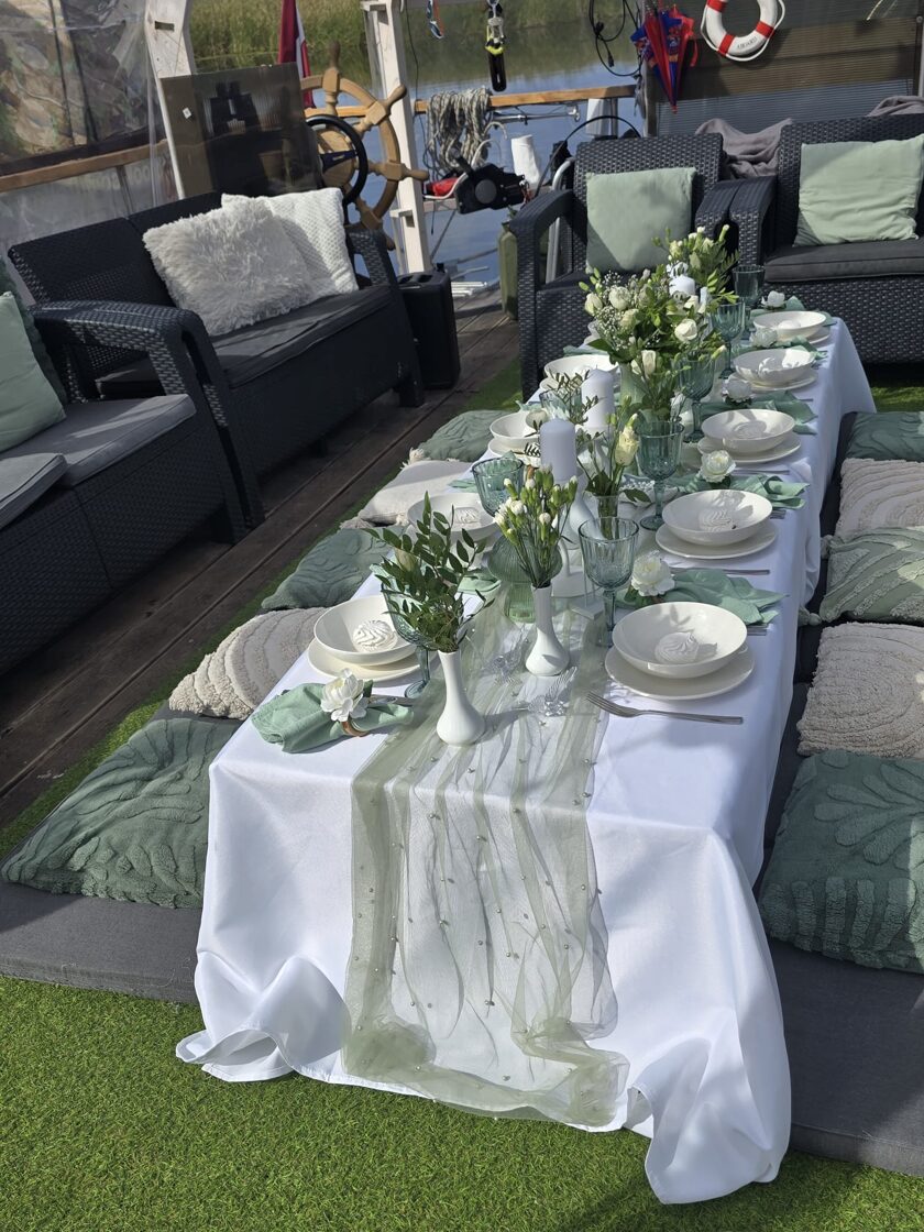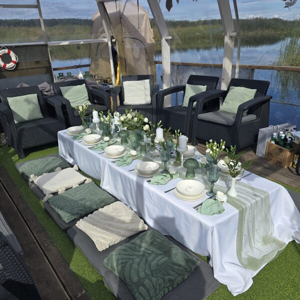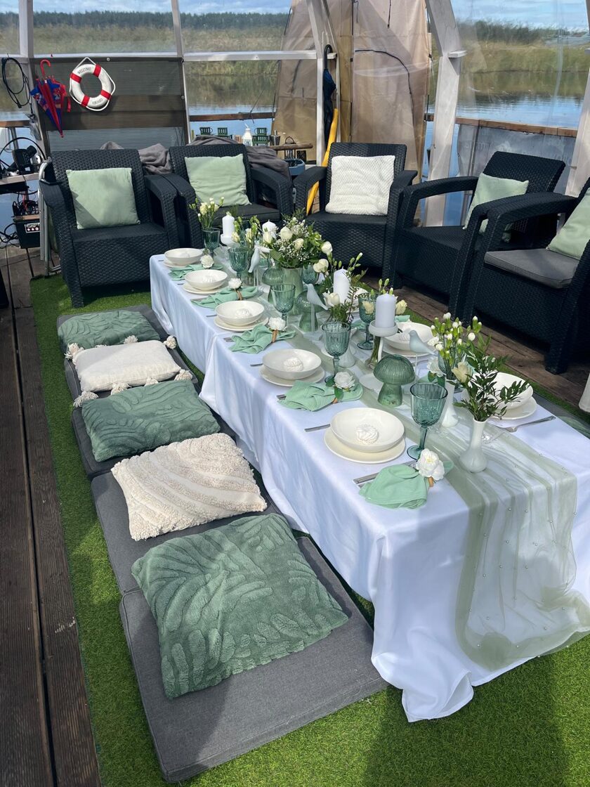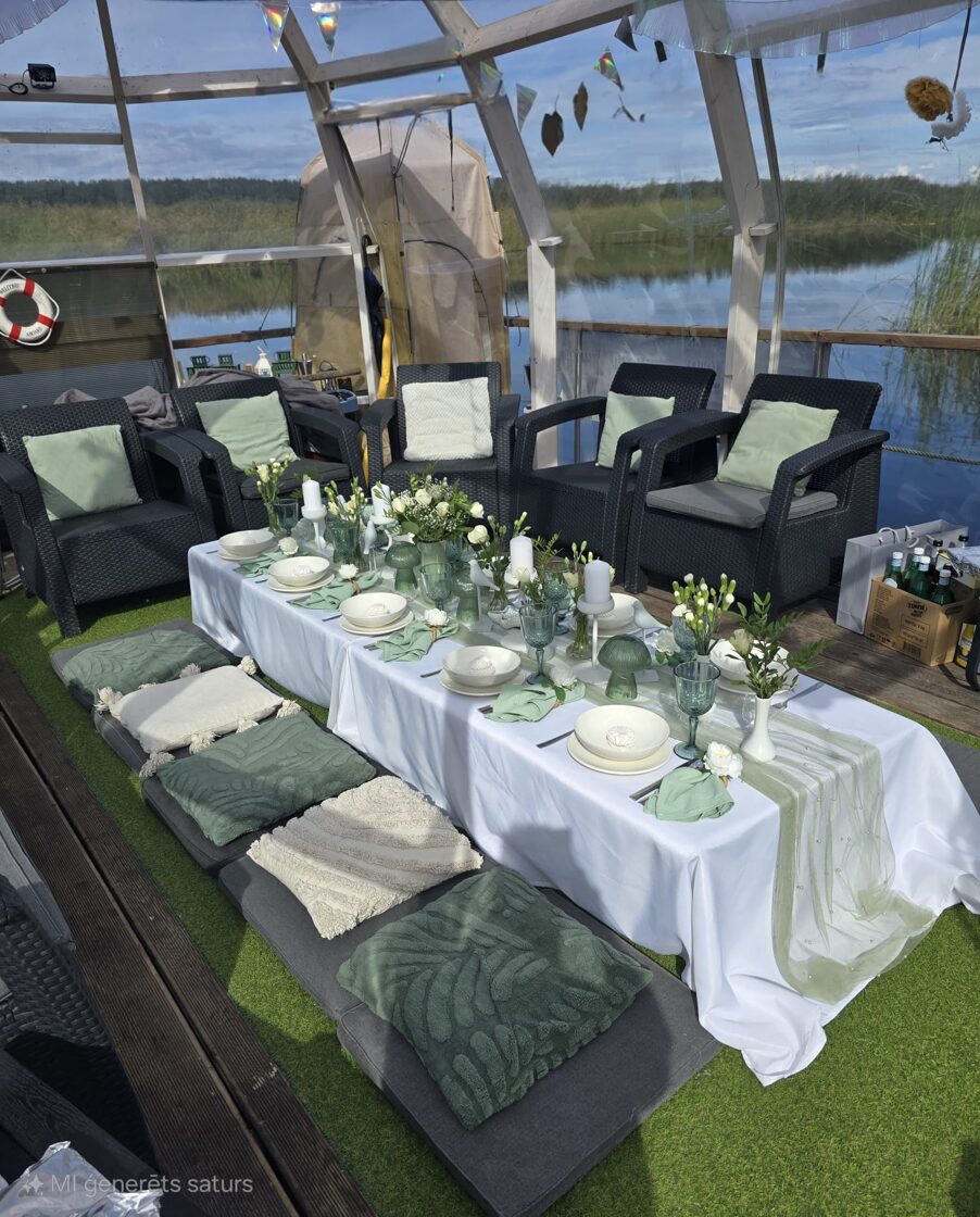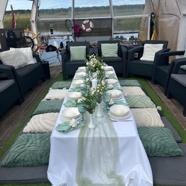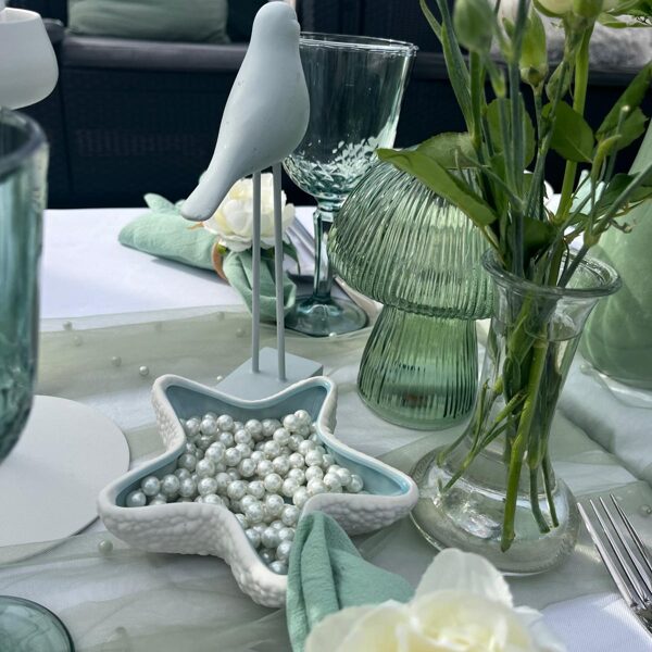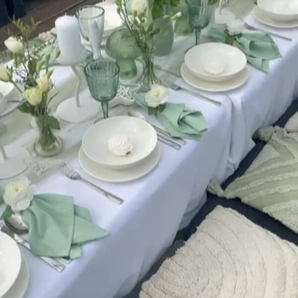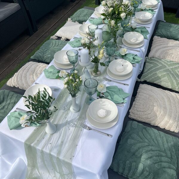 Šis galds ir kā mierpilna pastaiga dabā – zaļo un baltu toņu saspēle rada harmonisku, elegantu un vienlaikus mājīgu sajūtu.