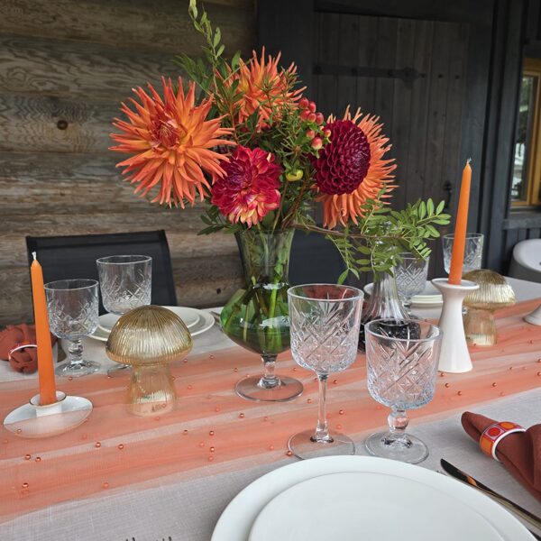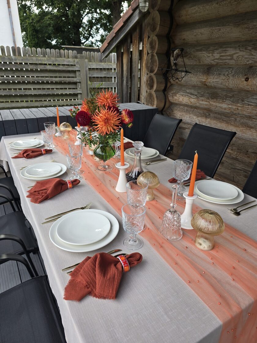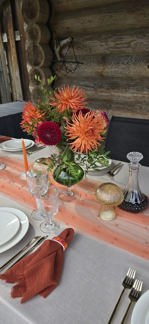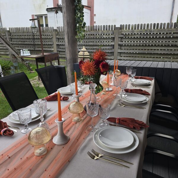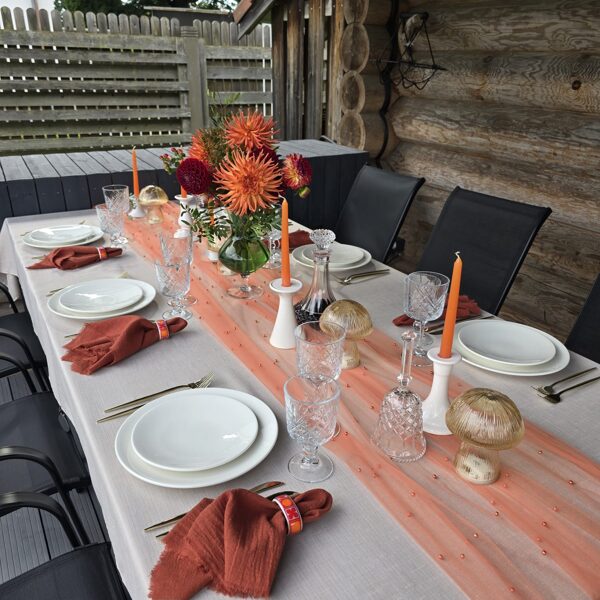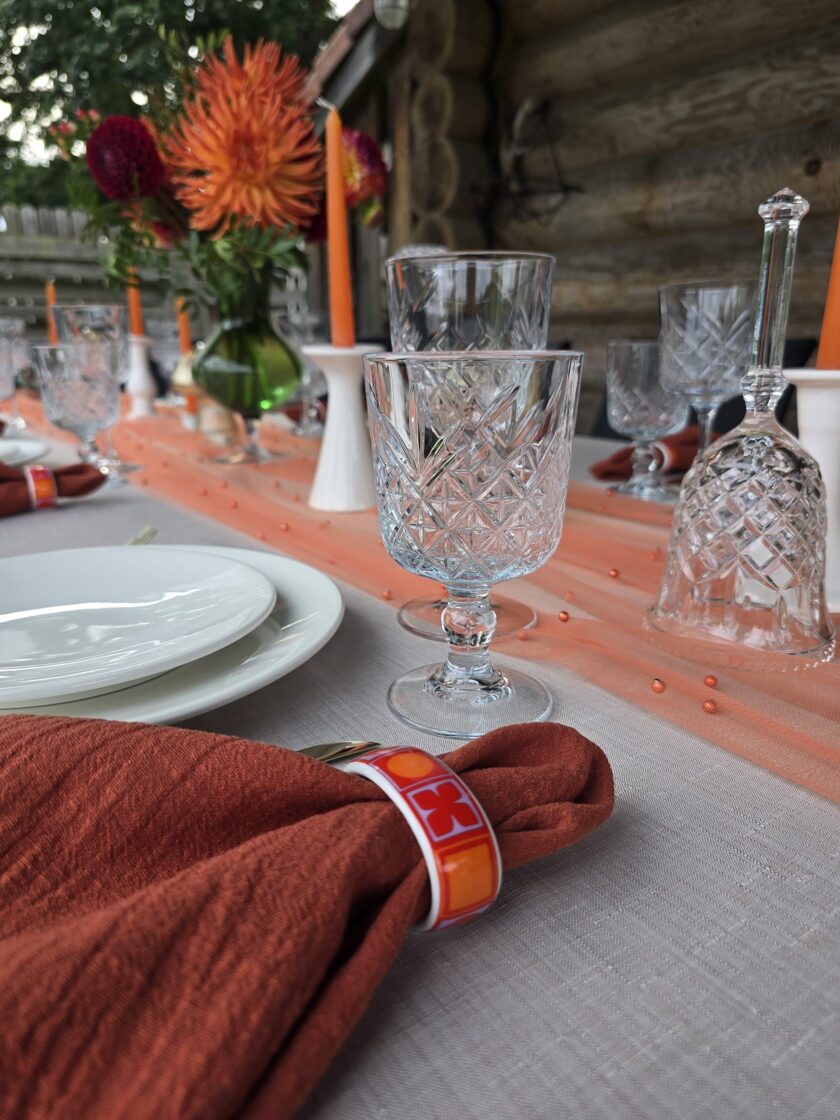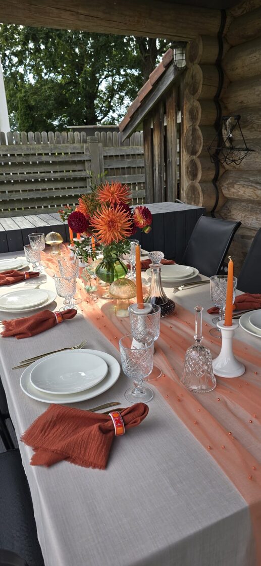 Šeit Svari iemirdzas savā būtībā – harmonijā, līdzsvarā un elegancē. Maigs bēšs galdauts kļūst par gaisīgu fonu, uz kura izceļas oranžais galda celiņš ar smalkām pērlītēm. Balti šķīvji un zelta piederumi piešķir izsmalcinātību, bet vintage porcelāna salvešu gredzeni ienes personisku šarmu un rudenīgu siltumu.