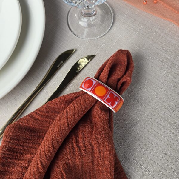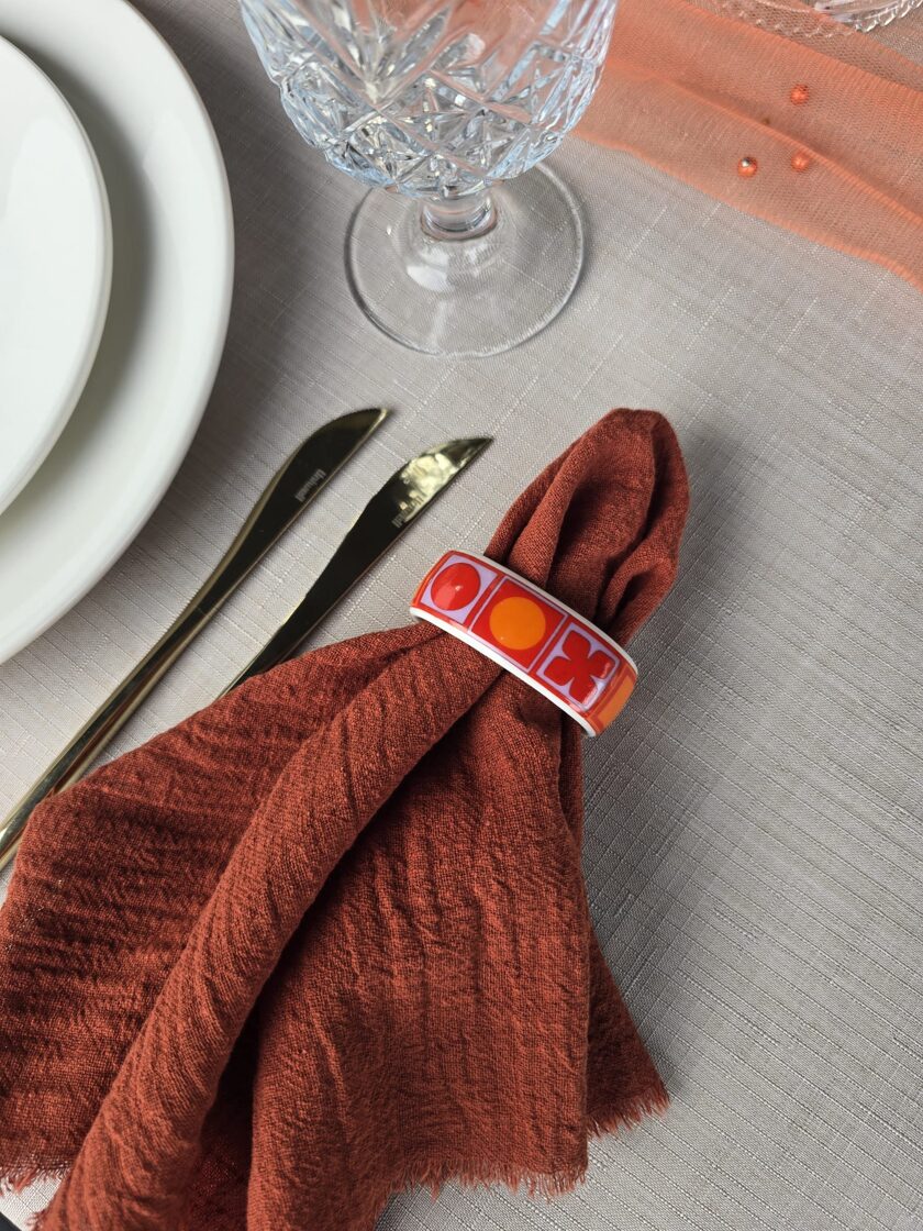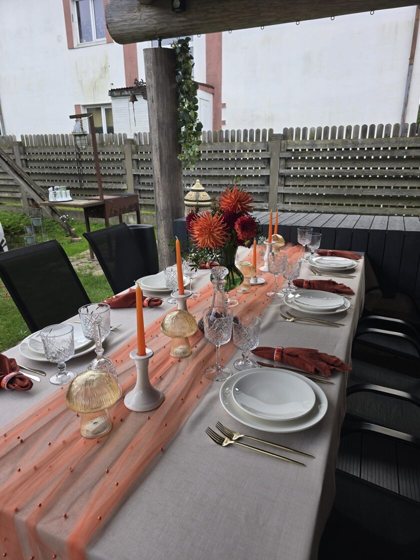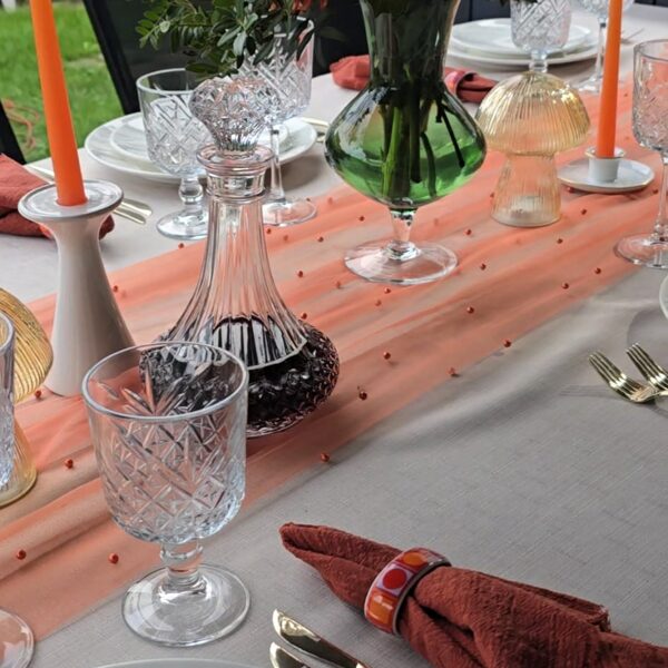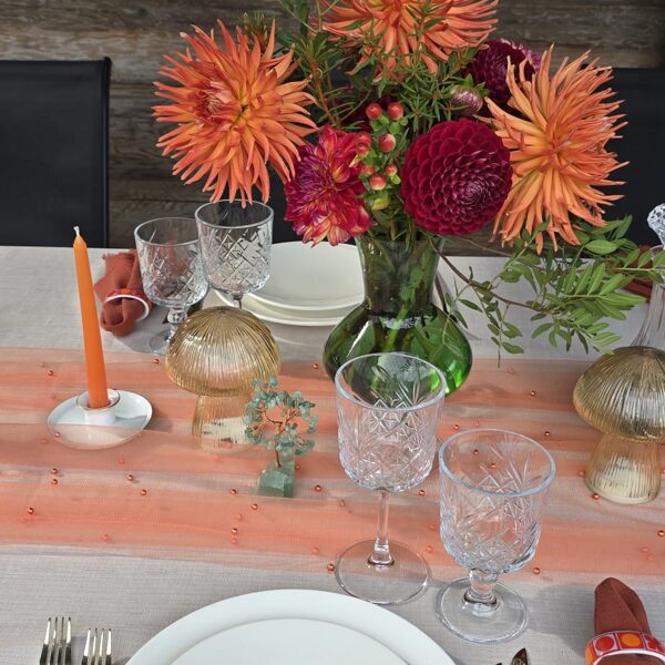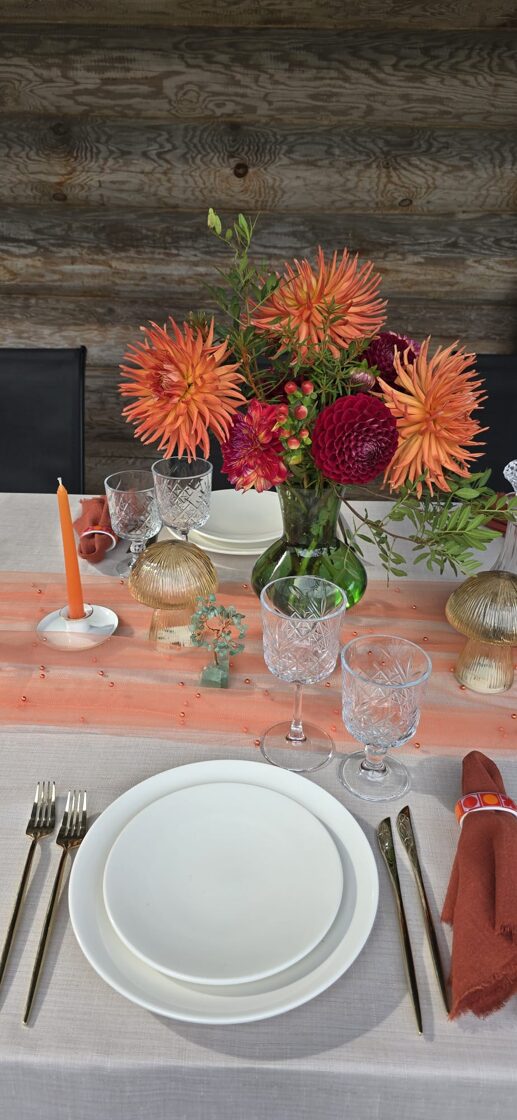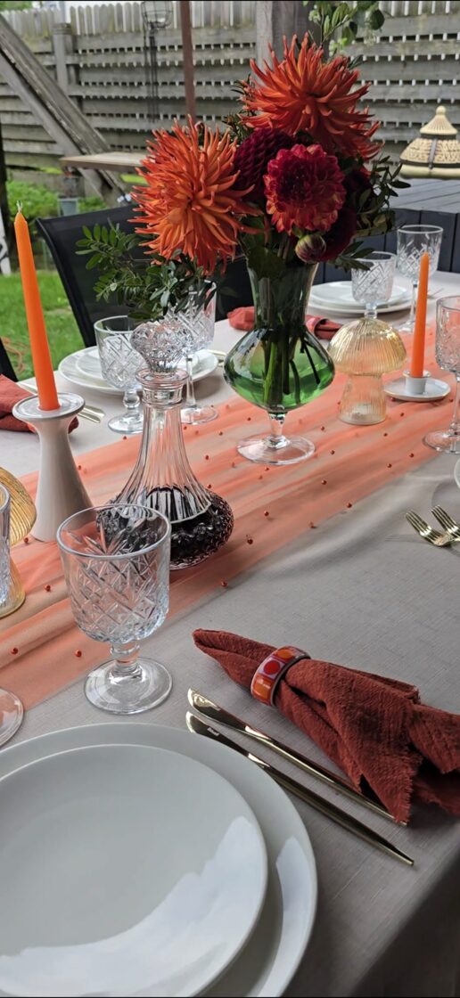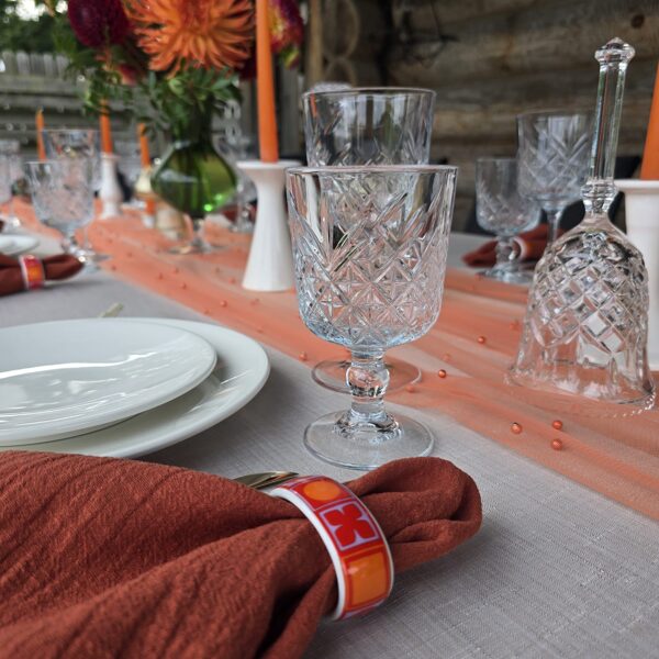 Šeit Svari iemirdzas savā būtībā – harmonijā, līdzsvarā un elegancē. Maigs bēšs galdauts kļūst par gaisīgu fonu, uz kura izceļas oranžais galda celiņš ar smalkām pērlītēm. Balti šķīvji un zelta piederumi piešķir izsmalcinātību, bet vintage porcelāna salvešu gredzeni ienes personisku šarmu un rudenīgu siltumu.