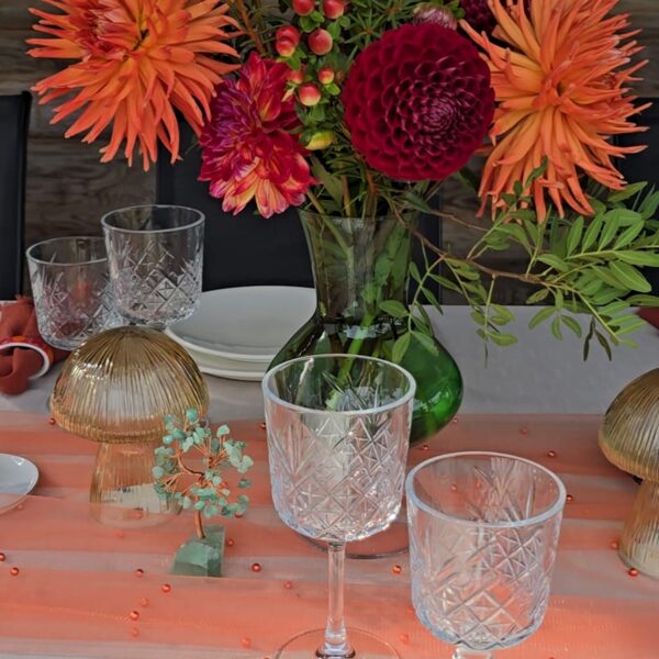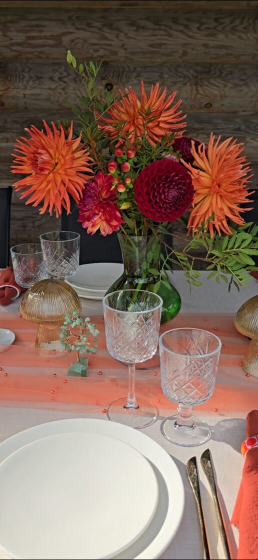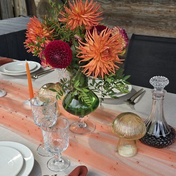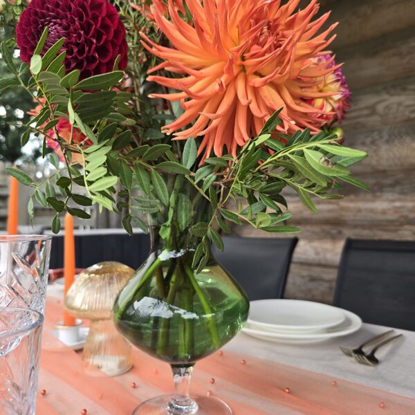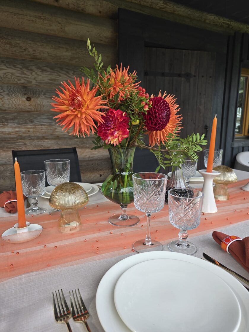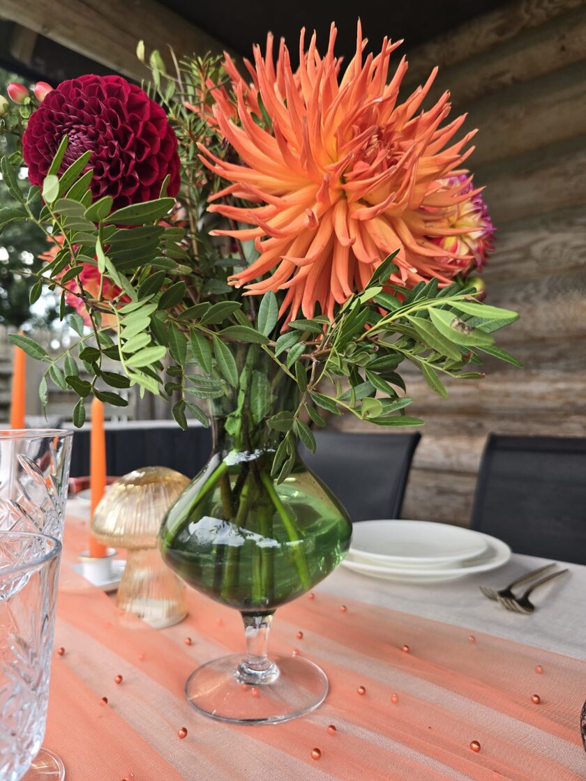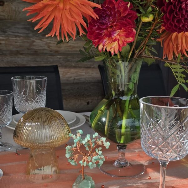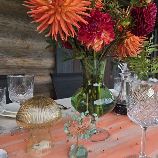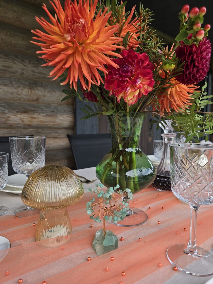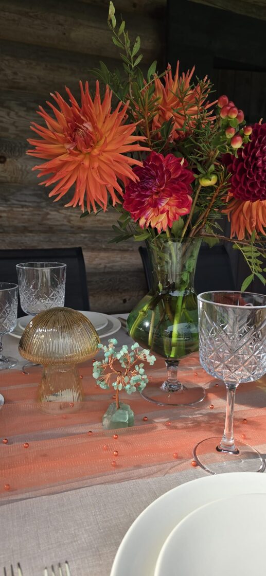Galda centrā – tumši zaļa vintage stikla vāze uz kājiņas ar bagātīgu ziedu kompozīciju košos rudens toņos. Blakus tai novietots zaļā ametista kociņš, kas simbolizē Svaru mieru un līdzsvaru.