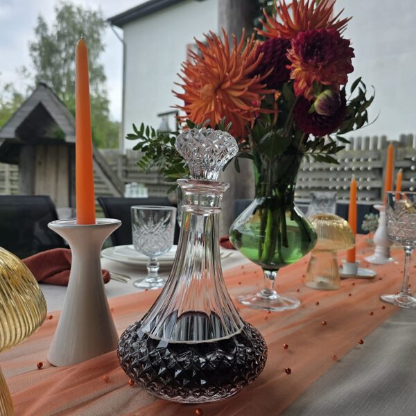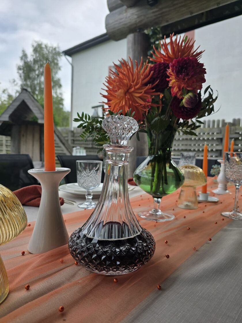 Siltās oranžās sveces un stikla lampiņas rada mājīgu gaismu, savukārt kristāla glāzes un vīna karafe piešķir klājumam vieglumu un eleganci.