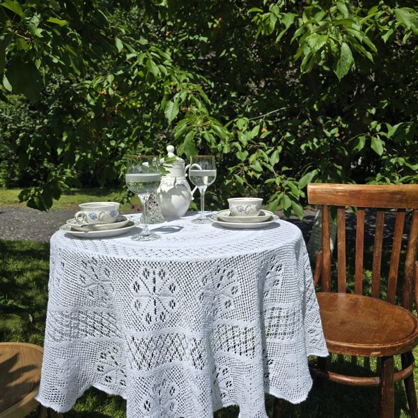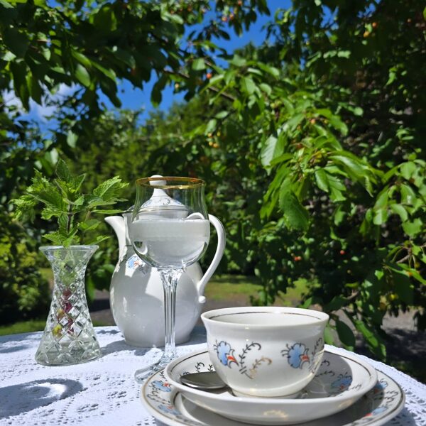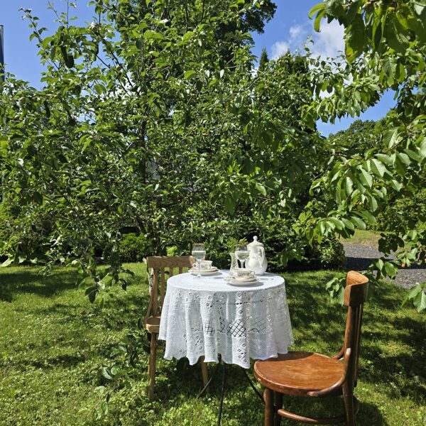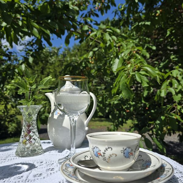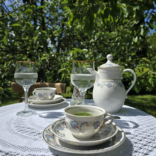 Ar tamborētu galdautu, smalkām vintage glāzēm un porcelāna traukiem, šis tējas galds iemieso lēnu dzīvi, cieņu pret lietu stāstiem un dārzā dzirdamo putnu čivināšanu.