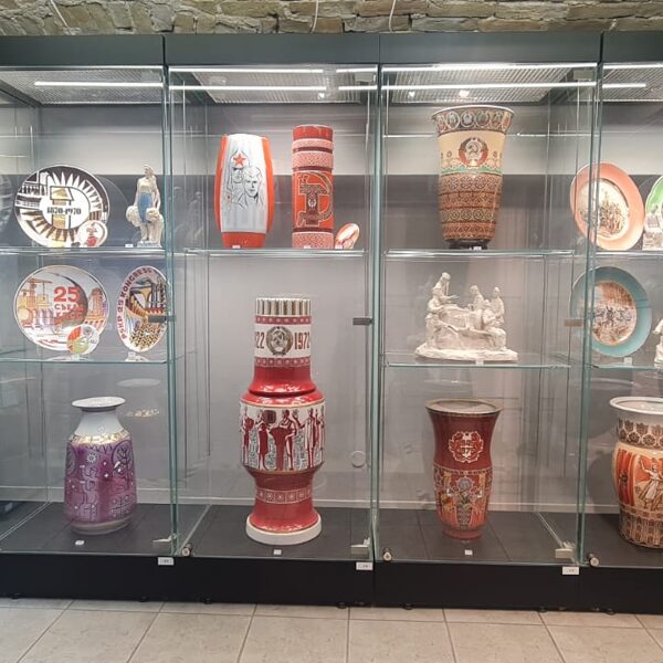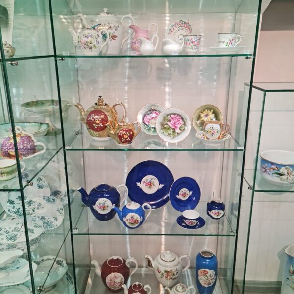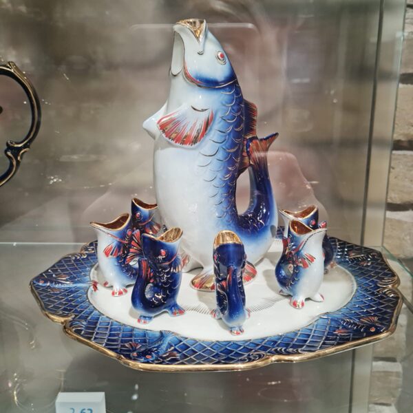Priekšmeti no servīzes Porcelāns. Virsglazūras dekors: krāsas klājums, apgleznojums ar ze